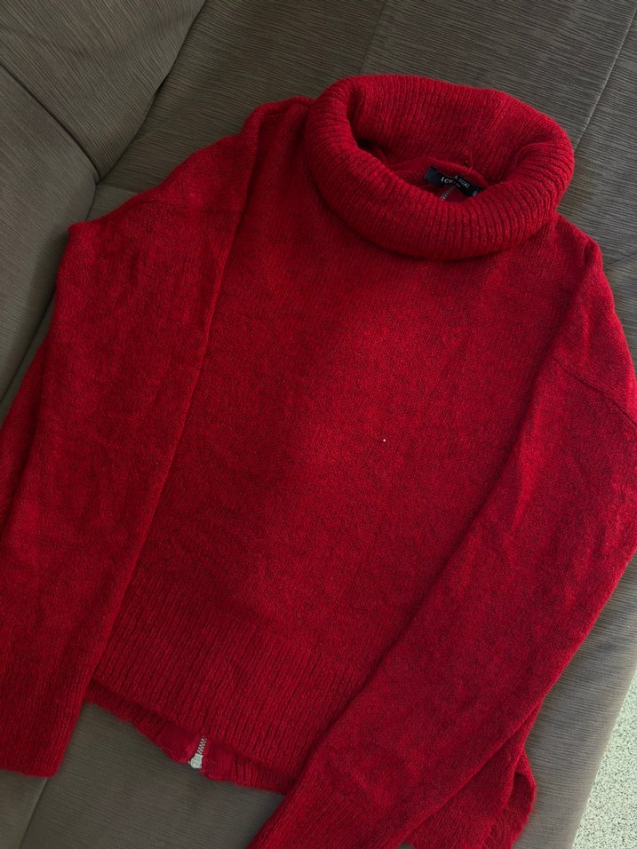 Kırmızı örgü yünden, boğazlı ve uzun kollu, vücuda oturan rahat ve şık bir kadın kazağıdır.