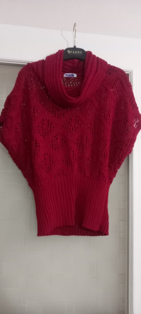 Kırmızı renkli, kolsuz, boğazlı ve midi boyda, rahat kesimli örgü triko. Günlük sokak stili için uygundur.