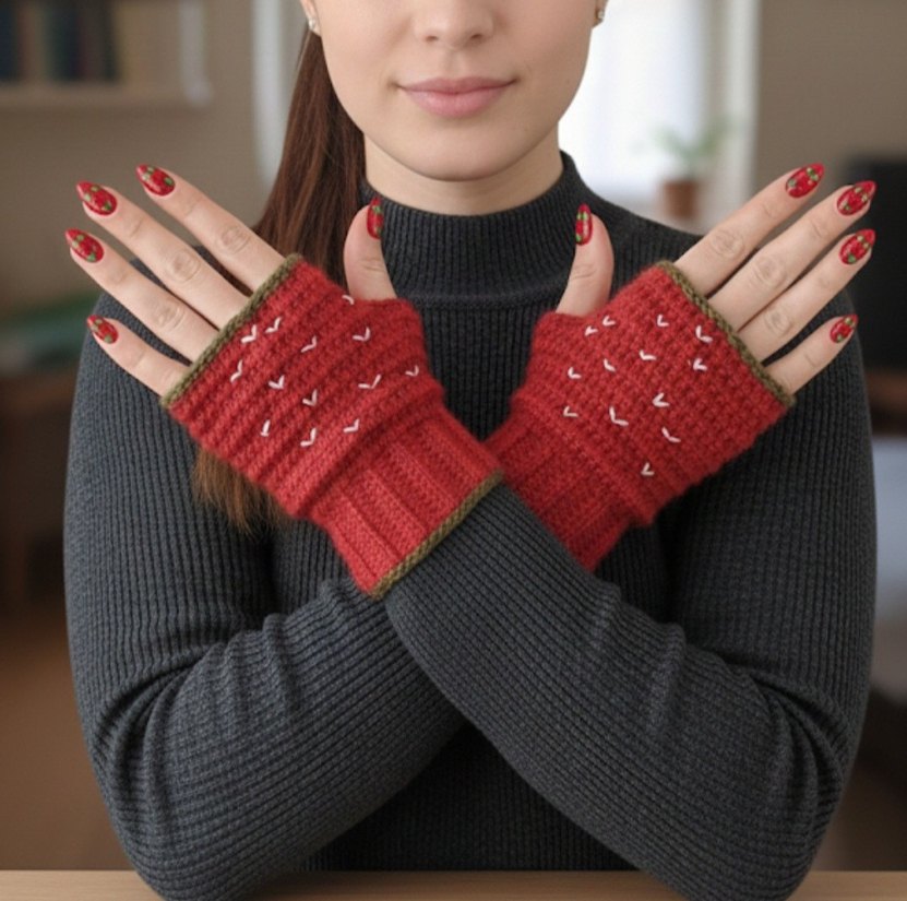 Görsel bana aittir ilan açıyorum Kırmızı örgü, bohem tarzda, renkli detaylara sahip kadın eldiveni, sıcaklık ve şıklık sağlar.