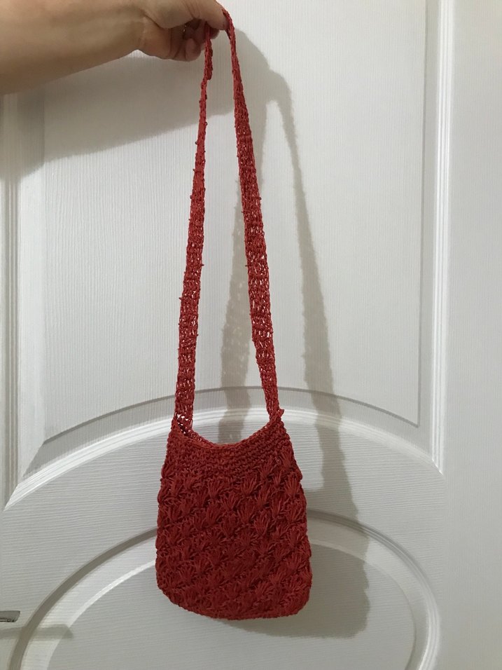 Uzun saplı, dantel detaylı kırmızı örgü bohem kadın çantasıdır. Renkli ve minimalist, retro tarzını yansıtır. Günlük kullanım için uygundur.