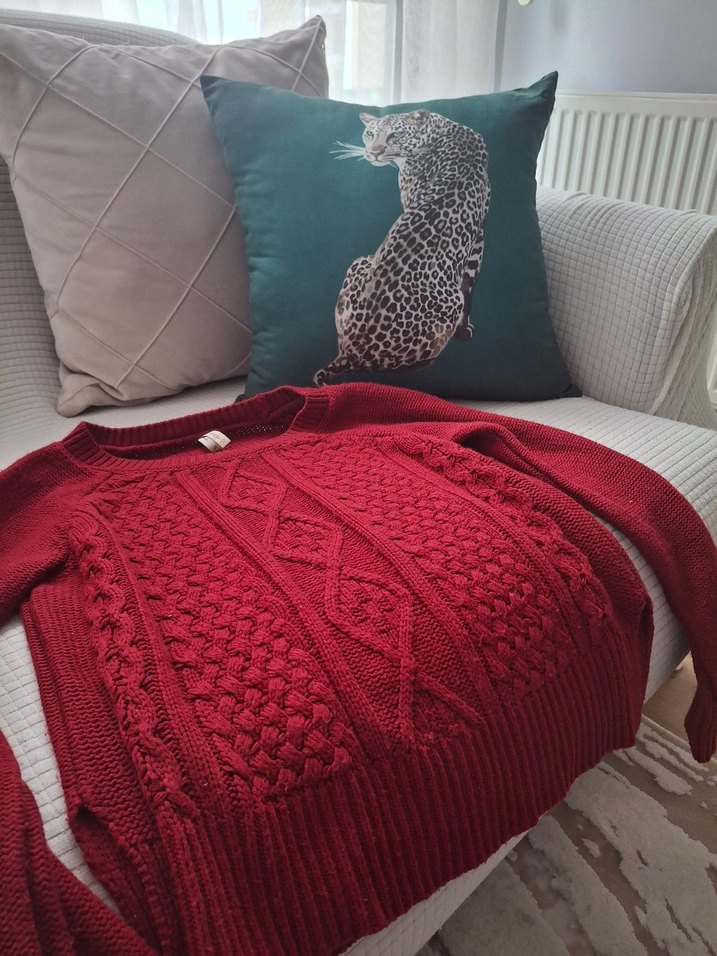 Kırmızı örgü kumaştan, bisiklet yaka ve uzun kollu, bol kesimli bohem tarzda günlük kullanıma uygun kadın kazak.