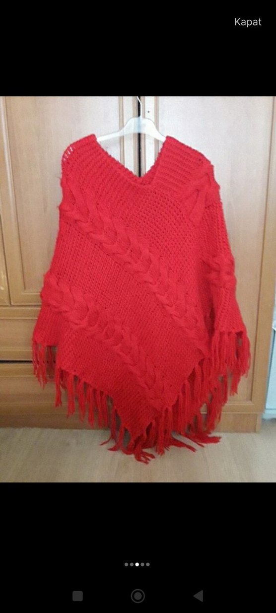 Kırmızı örgü bohem kadın panço, salaş kesim ve bisiklet yaka ile dikkat çeker. Kenarlarında püsküller bulunan rengarenk, rahat bir tasarıma sahiptir.