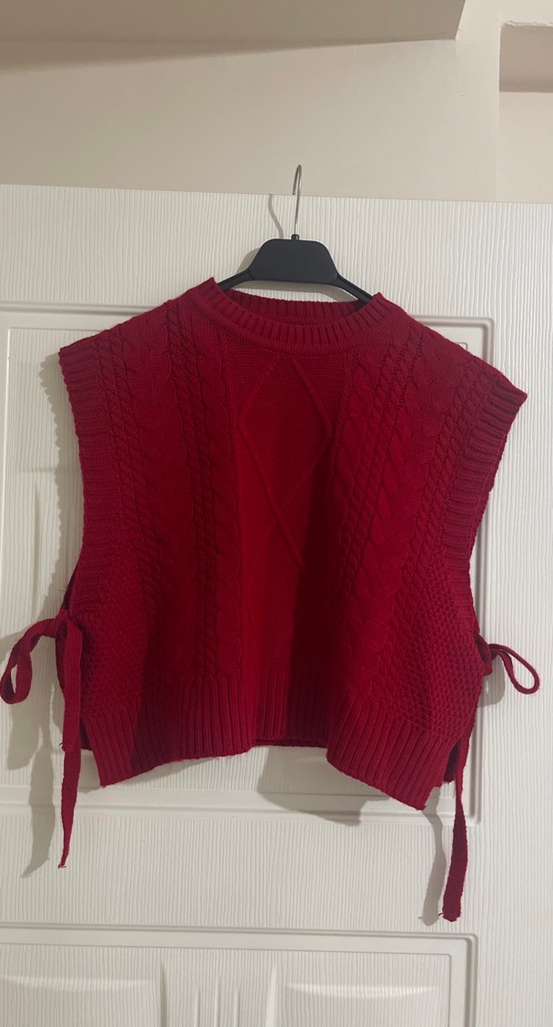 Koyu kırmızı renkli, yüksek yakalı ve bol kesim örgü kolsuz süveter. Yanlarda bağcıkları ve kısa boyu ile bohem tarzını yansıtır. Yeni sayılır sorunsuz standart bedendir