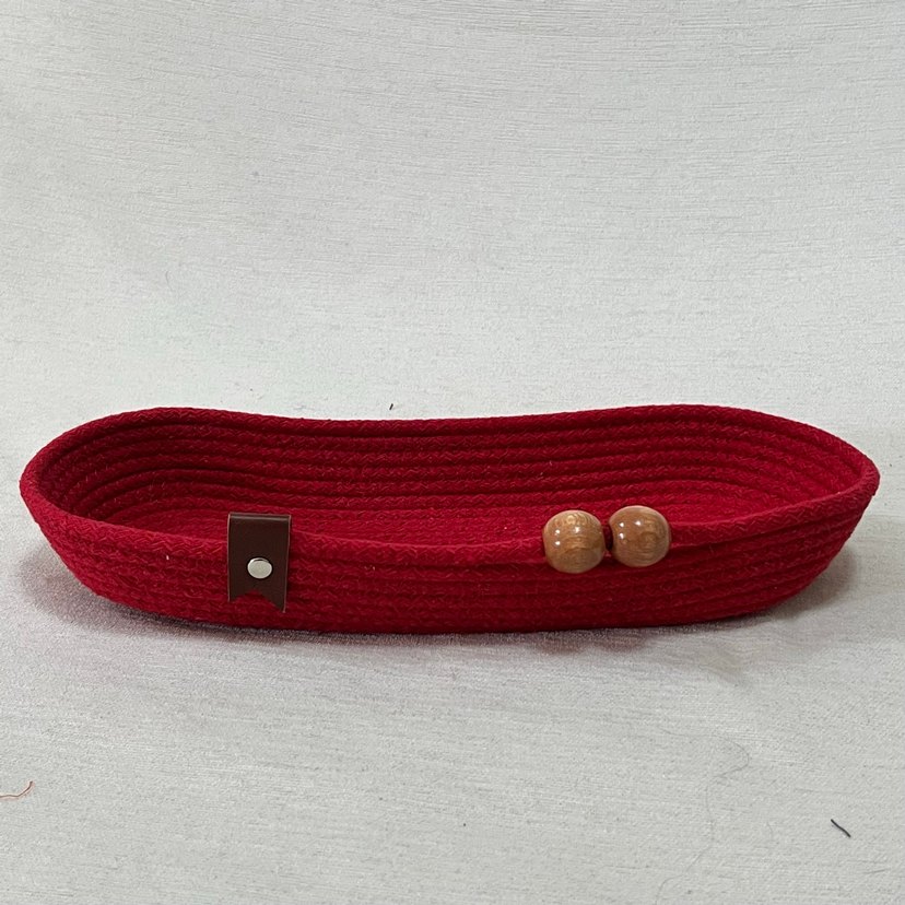 Kırmızı örme sepet, renkli tasarımı ve ahşap boncuk detaylarıyla dikkat çekiyor. Renk seçenekleri mevcuttur