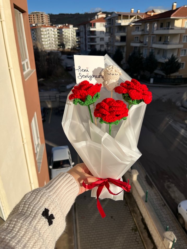 Kırmızı örgü çiçeklerden oluşan buket, şeffaf kağıtla sarılmış ve kırmızı kurdeleyle bağlanmıştır. Sevgi mesajı içeren küçük kart ve süslemelerle birlikte.