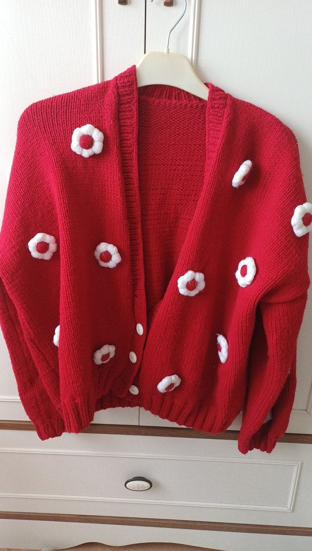 Kırmızı örme kumaştan, uzun kollu, bisiklet yaka ve bol kesim hırka. Üzerinde beyaz örgü çiçek detayları bulunur, rahat ve renkli bohem tarz sunar. ( el örgüsüdür 1 kez giyildi)