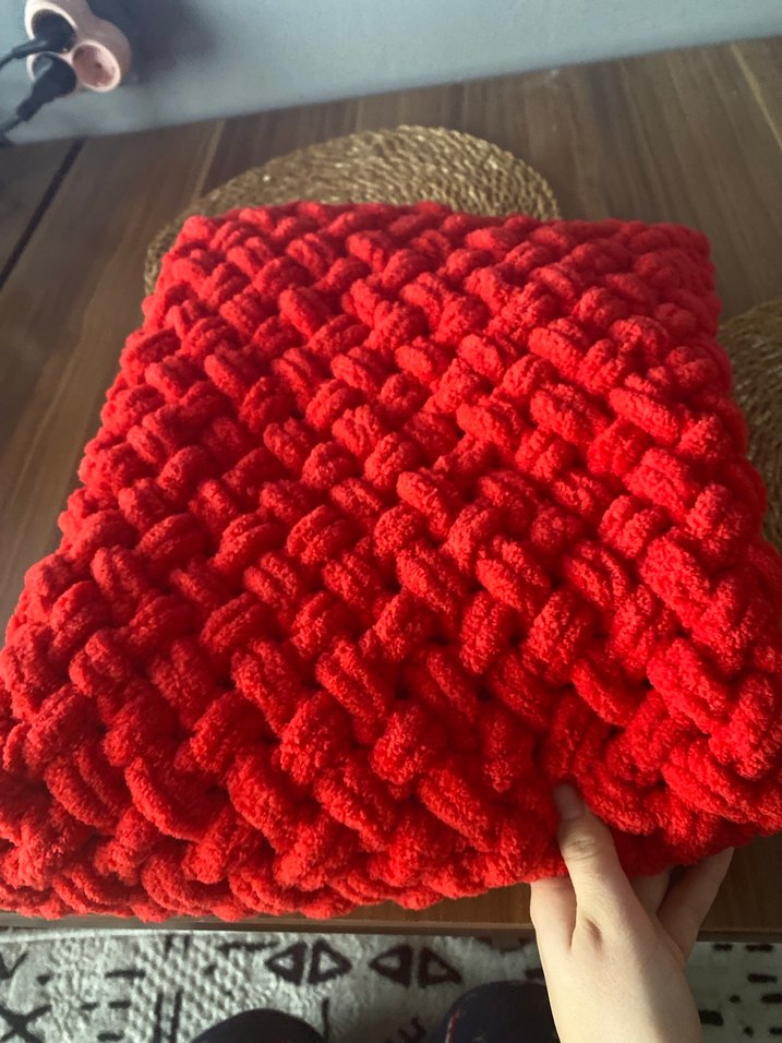 Yumuşak örgü kumaştan yapılmış, dokulu desene sahip renkli kırmızı çocuk battaniyesi, sıcaklık ve konfor sunar.