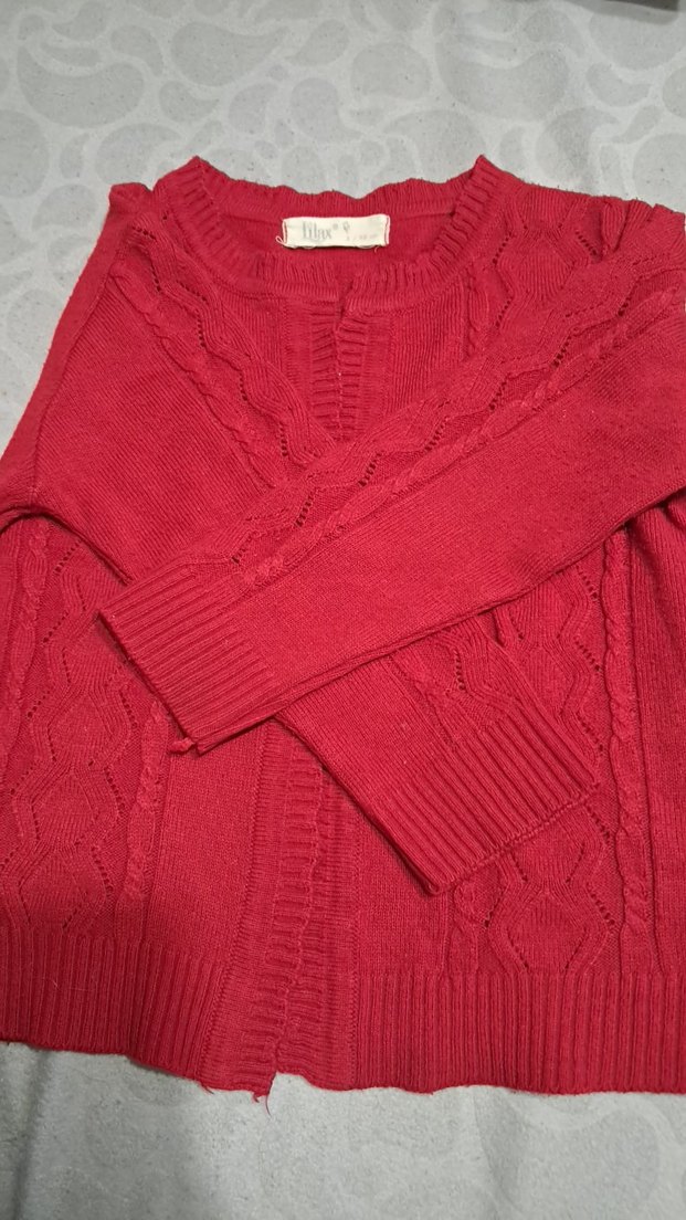 Kırmızı, uzun kollu ve fit kesim örgü çocuk kazak. Normal boyda, yuvarlak yakalı ve desen içermeyen rahat bir tasarım sunar.