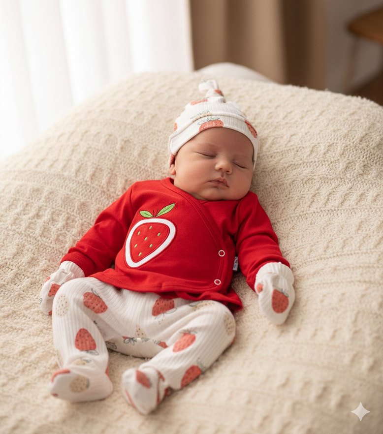 Renkli, kırmızı örgü üstü çilek baskılı, desenli pantolon, şapka ve eldivenli bebek hastane kıyafeti.