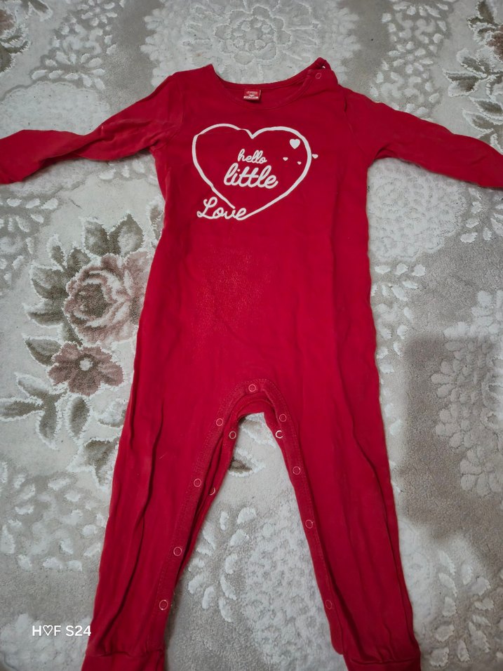 Kırmızı örgü bebek kız tulumu, renkli baskılı kalp ve yazı detaylı. Kolay giydirme için çıtçıtlıdır. ❤️