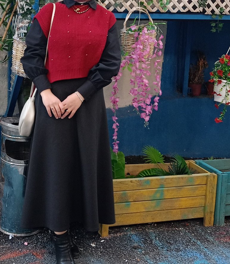 Koyu kırmızı renkte, örgü detaylı midi uzunlukta, salaş kesim ve senin stiline uygun kadın kazak ve etek. Günlük kullanıma uygundur.