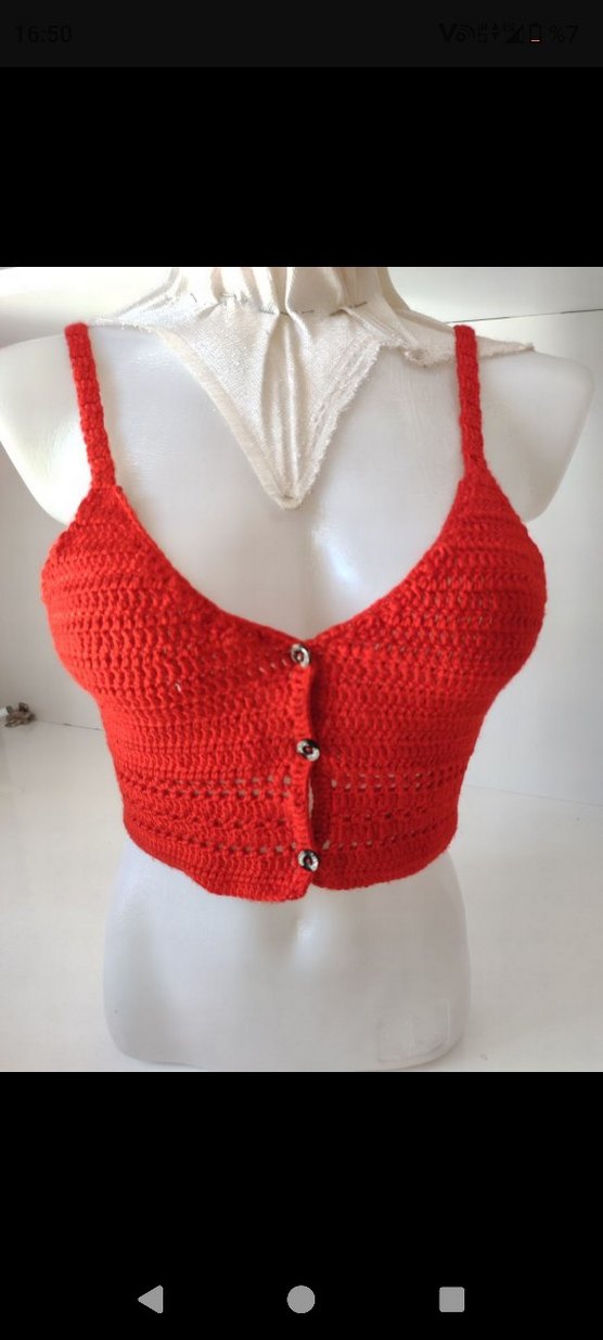 Kırmızı, örgü ve düğmeli, V yakalı, ince askılı, bohem tarzda kısa kesim büstiyer. Günlük kullanıma uygun ve renkli bir parça.