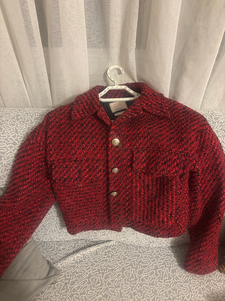 Koyu kırmızı örgü kumaştan, uzun kollu, yaka detaylı ve düğmeli kısa kesim kadın ceketi. Günlük kullanım için uygundur. Blair ceket