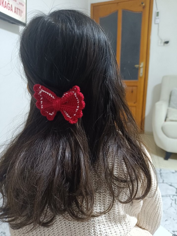 Kırmızı örgü kumaştan yapılmıştır. 5.5 cm klips toka dır. küçük fiyonk olarak örülmüştür.sayfamdaki fiyonklarla aynı ölçüde değildir.