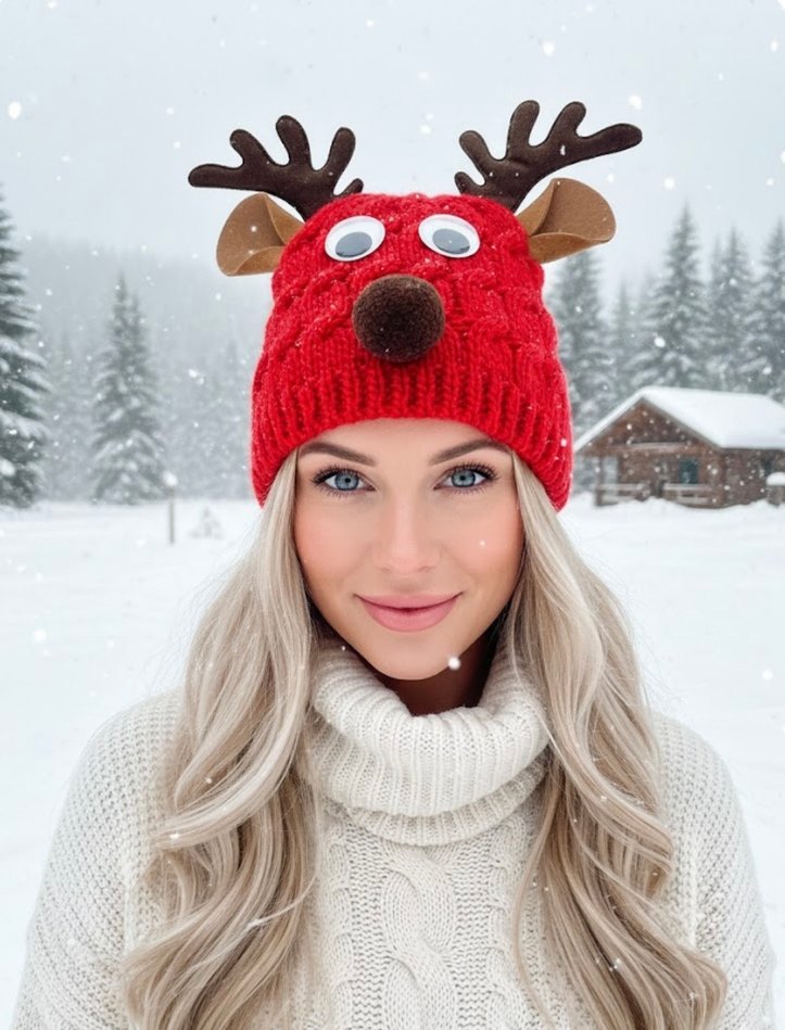Canlı kırmızı örgü bere, geyik figürü ve boynuz detaylarıyla tarzınızı yansıtır. Yumuşacık, sıcacık tutar ✨