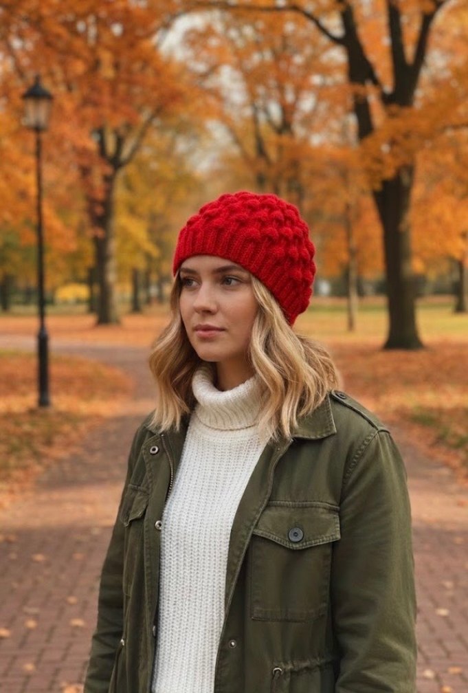 Kırmızı örgü dokusu ile sokak stiline uygun, rahat ve şık kadın bere.
