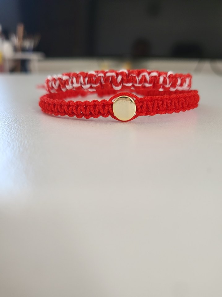 Kırmızı örgü kadın bileklik seti, ve altın tonlu yuvarlak detay içerir, günlük kullanım için bohem ve minimalist tarzda.