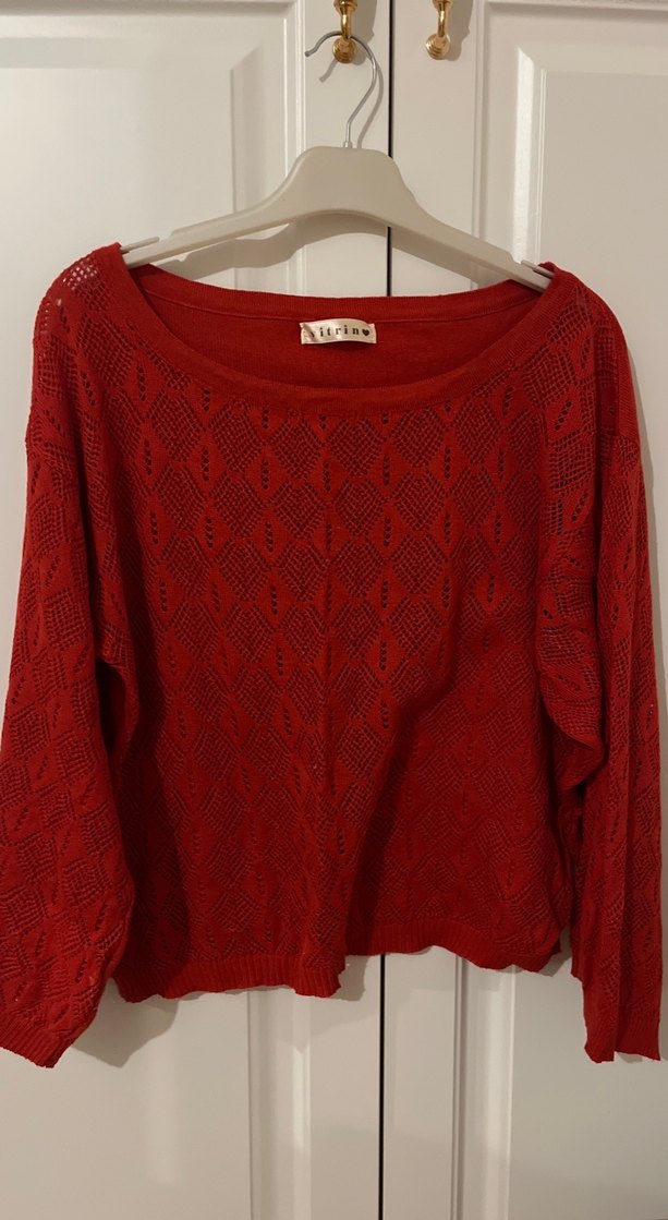 Kırmızı, uzun kollu ve yuvarlak yakalı örgü kadın kazak. Bohem tarzda, rahat kesimli ve midi boyda, günlük kullanıma uygun. Aurind etiketli.