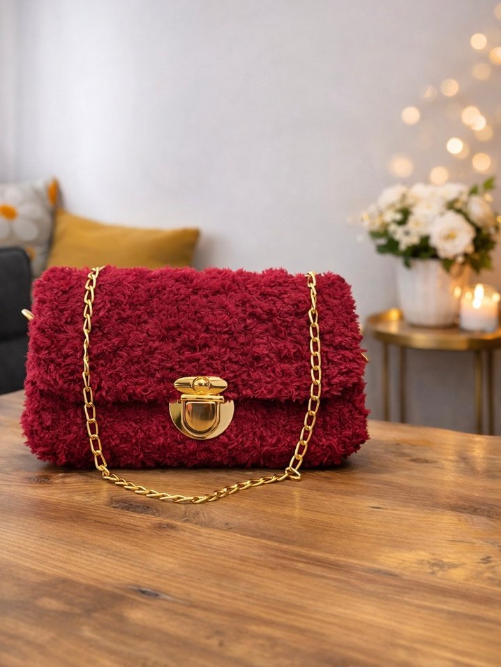 Yumuşak dokulu, örgü Kırmızı kadın çanta, altın zincir askı ve tokasıyla bohem tarz için uygun.