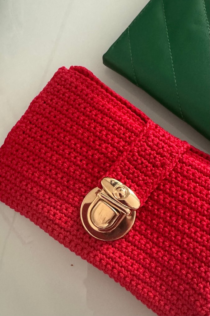 Kırmızı örgü kadının çantası, rahat bohem tarzı ve güvenli altın renkli toka ile günlük kullanıma uygun.