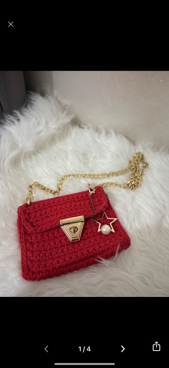 Kırmızı örgü kadın çanta, bohem tarzda işleme detaylı ve altın zincir askılı, günlük kullanıma uygun.