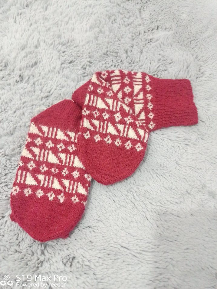 Canlı kırmızı renkte, geleneksel desenli örgü kumaştan kadın eldivenleri. Soğuk günler için sıcaklık ve rahatlık sağlar. çeyizlik sıfır ürün