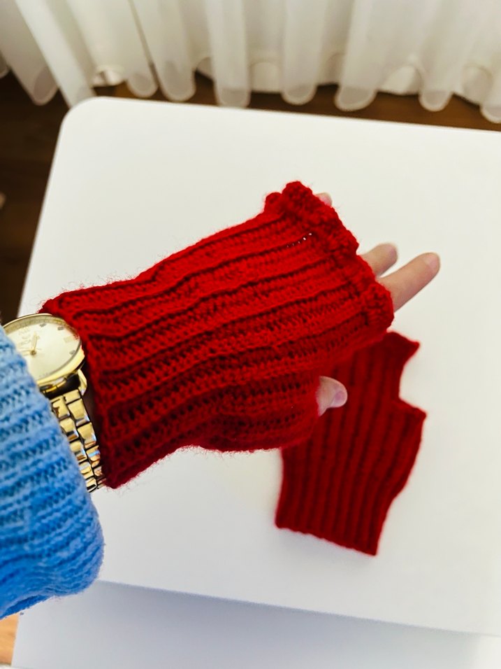 Canlı kırmızı renkte, örgü ve kabartmalı tasarıma sahip kadın eldiveni, bohem ve retro tarzlara uygundur.