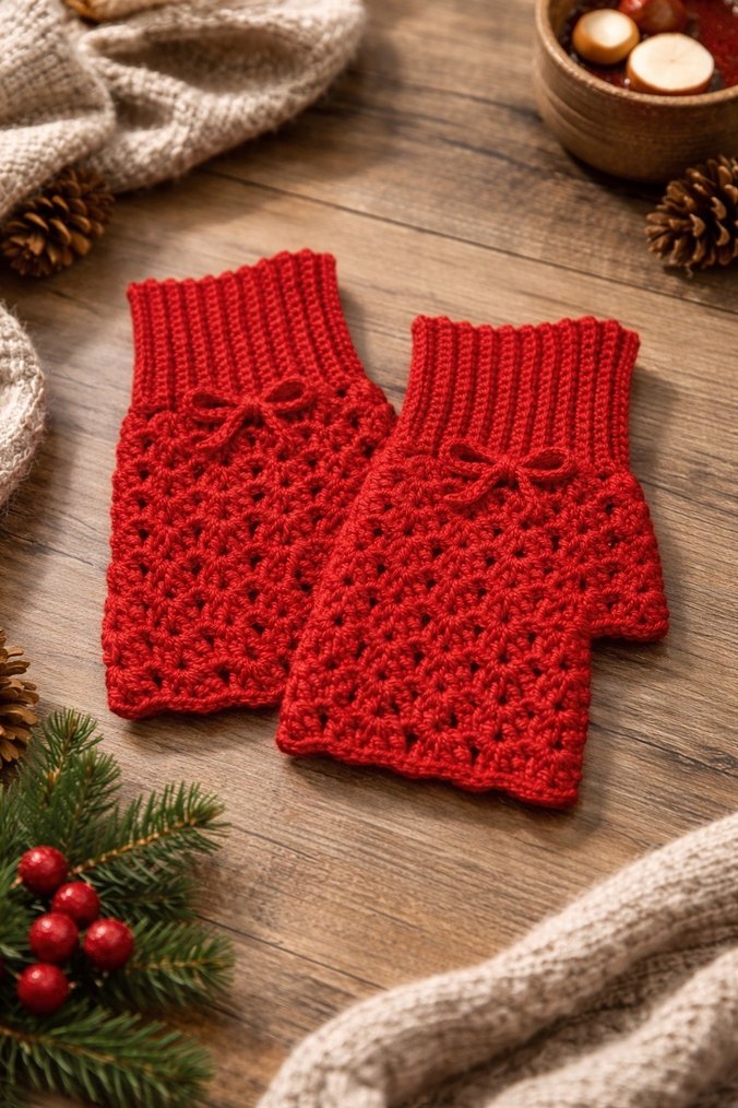 Kırmızı örgü kadın eldivenler, küçük fiyonk detayı ve bohem tarzıyla rahat bir dokunuş sağlar, kış kombinlerine renk katar.