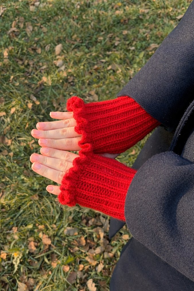 Kırmızı örgü eldivenler, fırfırlı kenarları ve fitilli deseniyle rahat ve renkli sokak stilini bir araya getirir. Moda tutkunları için ideal.