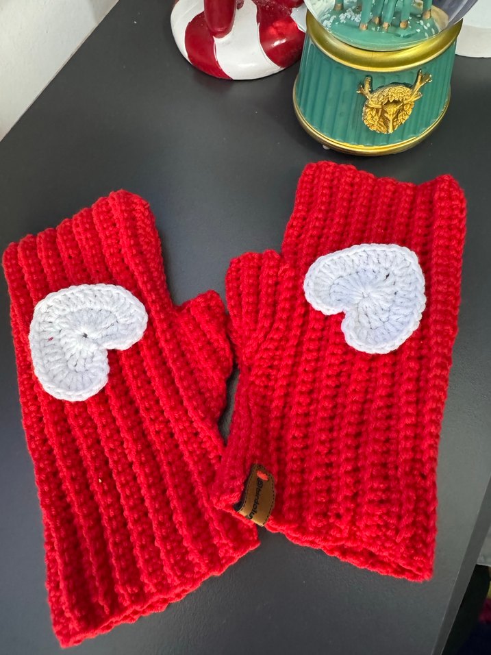 Kırmızı, örgü kadın eldivenleri, beyaz kalp detayları ile sıcak ve rahat bir dokunuş sunar. Bohem ve retro tarzlara uygundur. ❤️