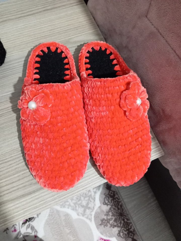 Kırmızı örgü malzemeden yapılmış, işlemeli çiçek detaylı, yüksek topuklu kadın ev terliği, günlük kullanım için rahat ve renkli tasarıma sahiptir.