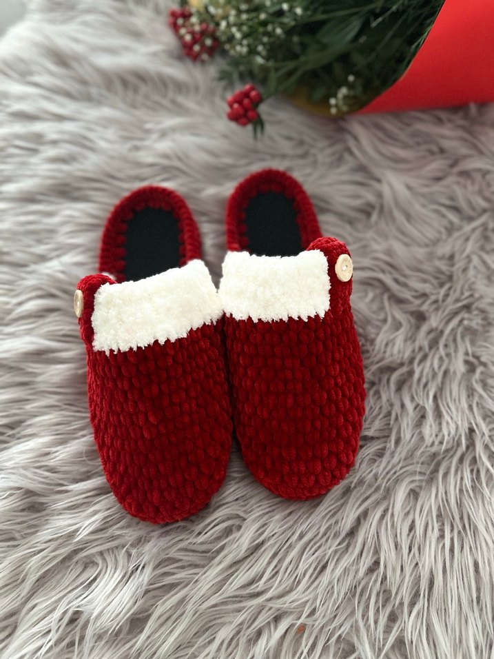 Canlı kırmızı renkte örgü kadın ev terliği, yumuşak beyaz manşetli. Nakış detaylı klasik tarzda, ince topuklu, günlük kullanıma uygun.
