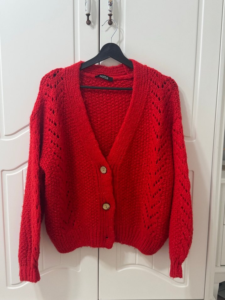 Kırmızı örgü hırka, bol kesim, uzun kollu ve V yakalıdır. Bohem tarzda, rahat dokusu günlük kullanım için uygundur. Midi boy ve desensizdir.