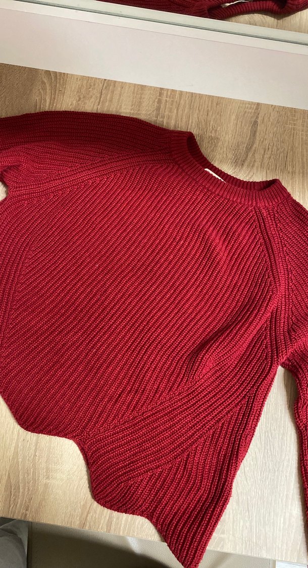 Kırmızı örgü kumaştan, yuvarlak yakalı ve uzun kollu, bol ve rahat kesimli kadın kazak. Düz ve desen içermeyen, günlük sokak stili için uygun. hiçbir sorunu yok