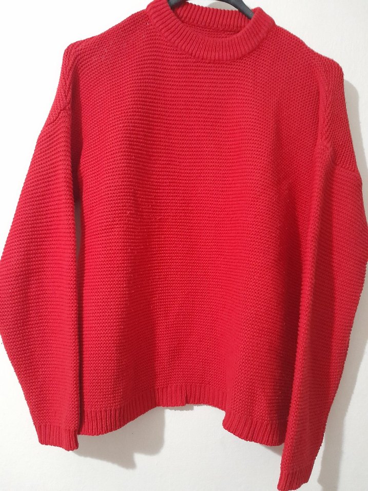 Kırmızı örgü kadın kazak, yuvarlak yaka ve uzun kolludur. Rahat kesimi ve normal boyu ile günlük kullanım için uygundur.