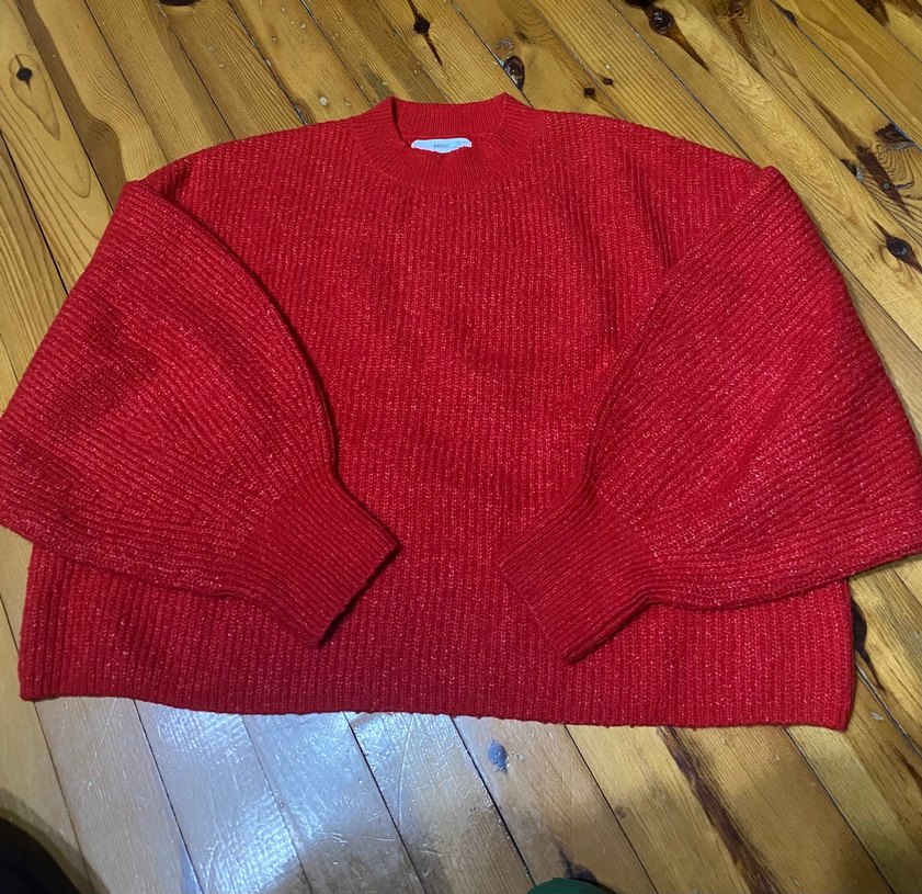 Kırmızı örgü kadın kazağı, uzun kollu, yuvarlak yaka ve bol kesime sahiptir.