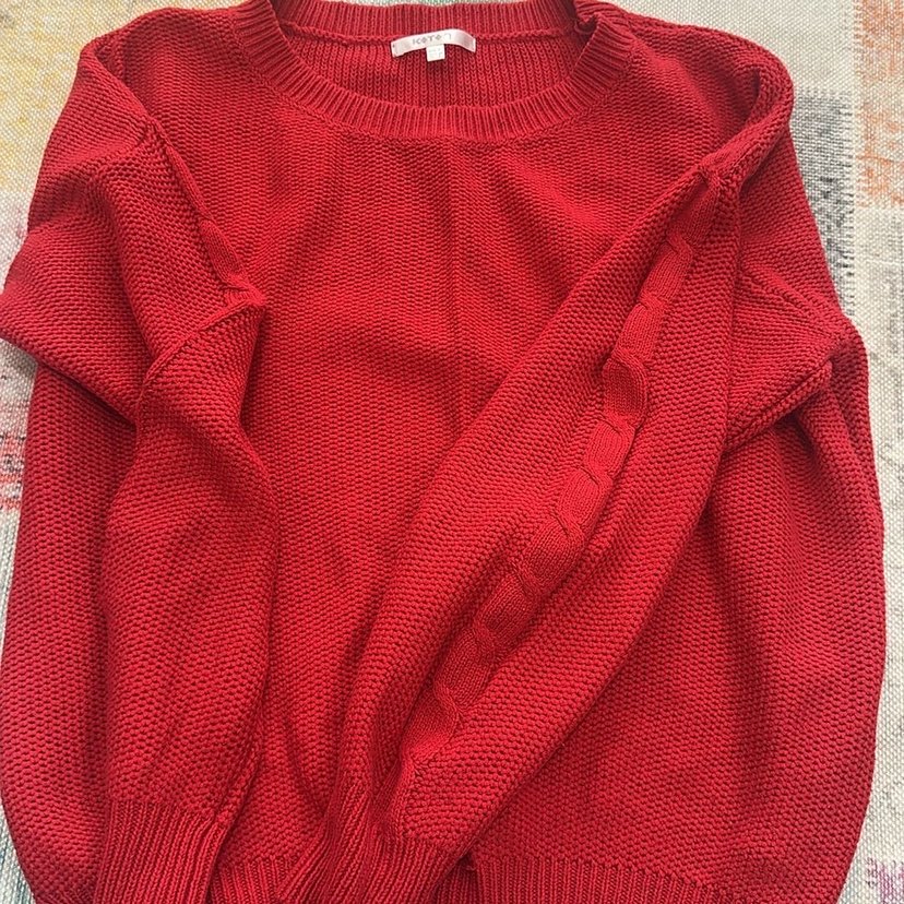 Parlak kırmızı örgü kumaştan, uzun kollu ve salaş kesim kadın kazak. Yuvarlak yaka ve sade desensiz, günlük sokak stili için uygun.