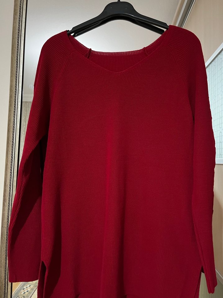 Kırmızı örgü kadın kazağı, yuvarlak yaka ve uzun kolludur. Yün malzemeden yapılmış, rahat kesimli ve normal uzunluktadır. Günlük kullanım için uygundur.