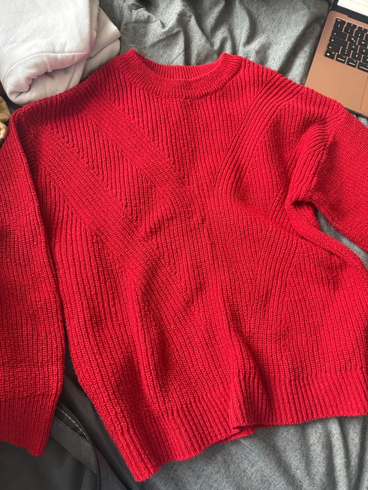 Kırmızı, örgü kumaştan, yuvarlak yakalı ve uzun kollu, vücuda oturan kadın kazak. Desensiz tasarımıyla rahat ve günlük kullanıma uygun.