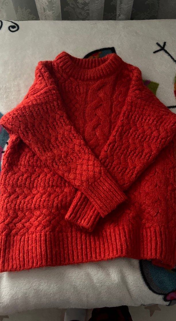 Kırmızı örgü kumaştan, bohem tarzda, bisiklet yaka ve uzun kollu, normal boyda, vücuda oturan kadın kazak. Rahat ve şık bir günlük tercih.