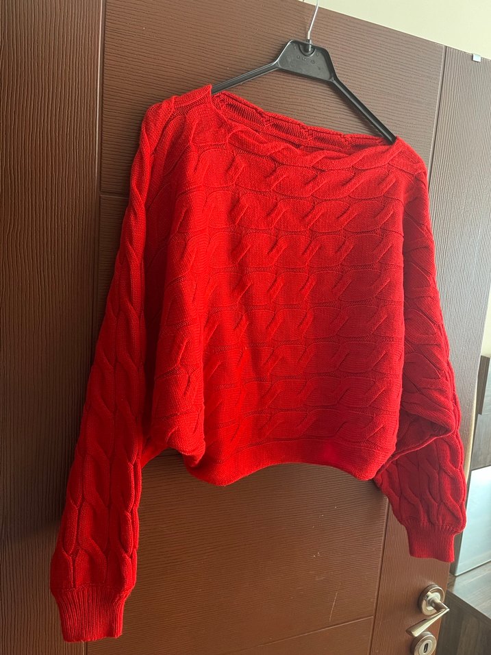 Kırmızı örgü, yuvarlak yaka, uzun kollu ve bol kesim kısa uzunlukta kadın kazak, rahat ve şık bir görünüm sunar.