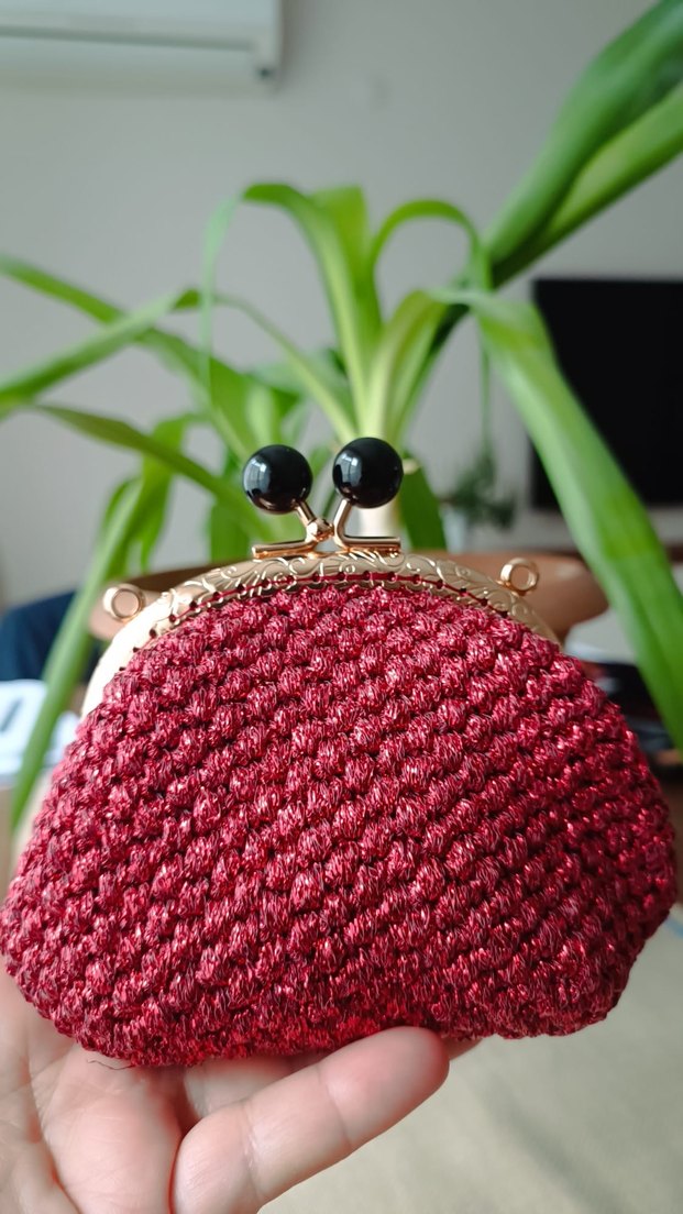 Kırmızı renkli, nakışlı örgü kadın portföy çanta, siyah boncuklu vintage kapanışa sahiptir. Rahat ve bohem tarzıyla günlük kullanıma uygundur.