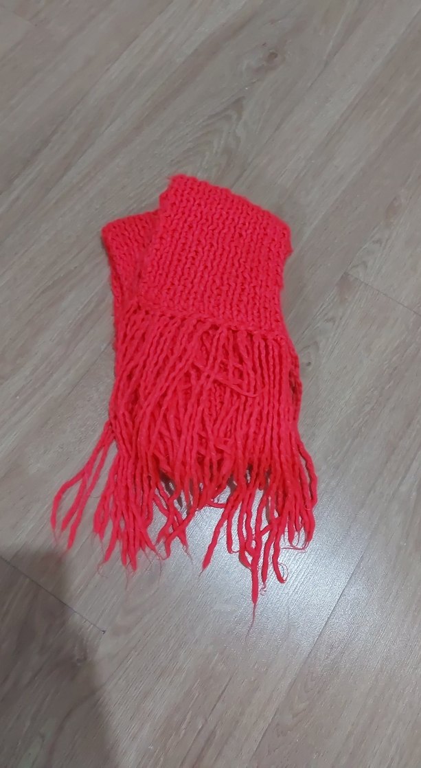 Renkli kırmızı örgü kadın şal, püsküllü kenarlarıyla rahat ve bohem tarz için uygundur.