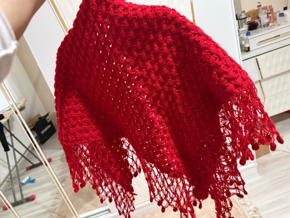 Canlı kırmızı renkte, örgü dokuma kadın şalı. Rahat ve bohem tarzda, sade ve temel tasarıma sahip, püsküllü kenarları ile.