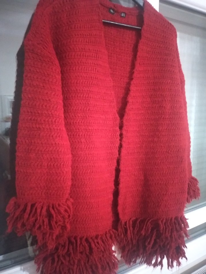 Parlak kırmızı renkli, örgü dokulu kadın şal, püsküllü kenarlarıyla bohem ve retro tarzını yansıtıyor. Rahat ve sıcak tutar.