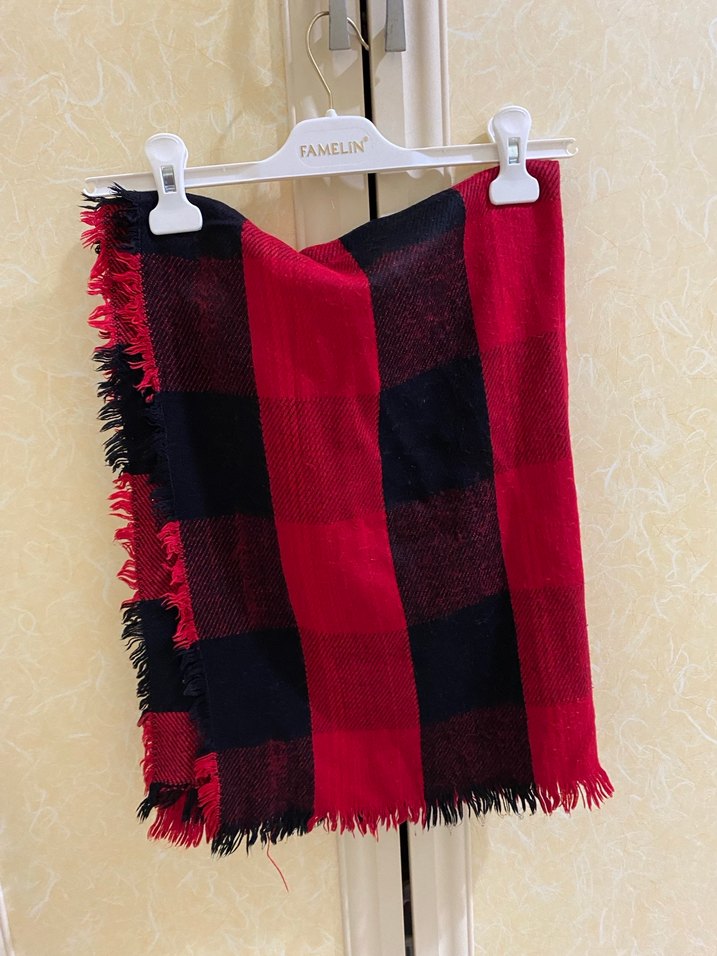 FAMELIN markalı bu kadın şalı, koyu kırmızı ve siyah örgü tekstil ile bohem tarzda ve rahat bir görünüme sahip. Uçları püsküllüdür.