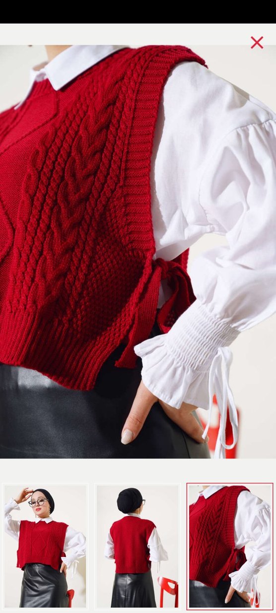 Koyu kırmızı renkli, nakış desenli, yuvarlak yakalı, bohem ve rahat tarzda, vücuda oturan örgü kadın süveter.