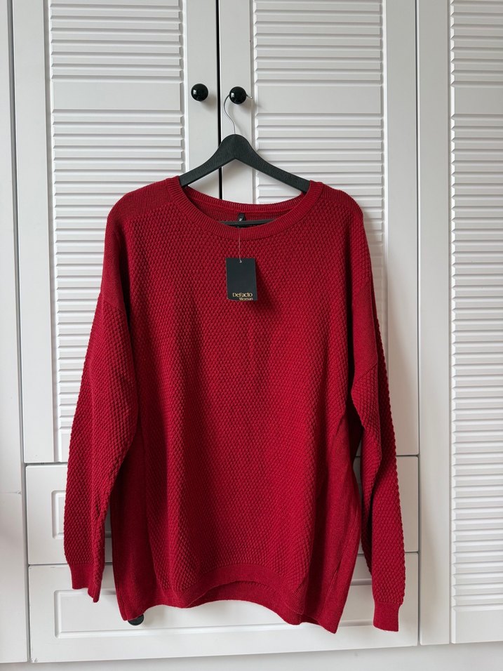 Kırmızı örgü kumaştan, yuvarlak yaka ve uzun kollu, rahat kesim bir kadın triko kazak. Günlük sokak stiline uygun koyu canlı renkte.