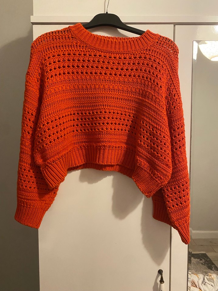 Kırmızı örgü trikodan üretilmiş, bol kesim ve uzun kollu kadın kazak. Yuvarlak yaka ve gündelik kullanıma uygun rahat normcore tarzında.