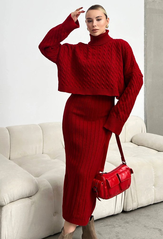 Koyu kırmızı renkli, yüksek yakalı ve uzun kollu örgü elbise, rahat kesimiyle günlük kullanıma uygundur.